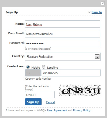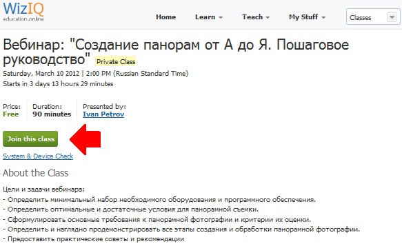 Возможно, что в случае, если Вы не имеете действующей регистрации на сайте WizIQ, то при нажатии на “Join this class” откроется форма регистрации:
