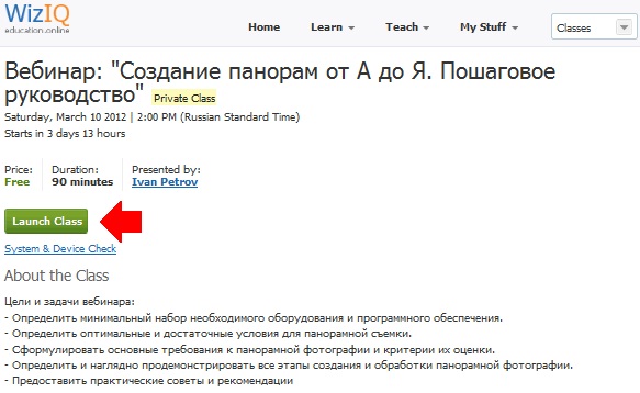 После регистрации (если она потребуется), на странице вебинара нажмите кнопку “Launch Class”