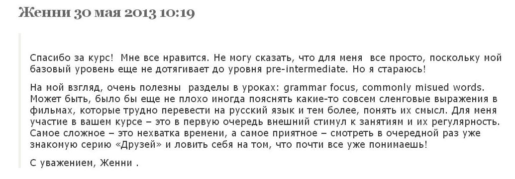- — Многие жалуются на то, что американцы говорят очень быстро, и они не успевают перевести сказанное. Важно смотреть каждый эпизод как минимум 2-3 раза прежде чем выполнять задания
