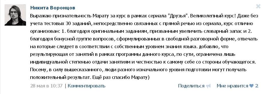 Плюс у каждого участника имеется доступ к общему чату через Скайп, в котором можно задавать вопросы опытному преподавателю в режиме реального времени, плюс каждую неделю проводятся разговорные онлайн-клубы, на которых вы сможете закрепить полученные знания на практике.